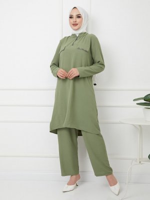 Olcay Açık Yeşil Taşlı Şerit ve Fermuar Detaylı Büyük Beden Pantolon Tunik Takım