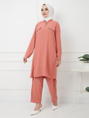 Olcay Gül Kurusu Taşlı Şerit ve Fermuar Detaylı Büyük Beden Pantolon Tunik Takım