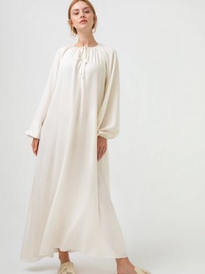 Touche Prive Krem Büzgülü Keten Elbise