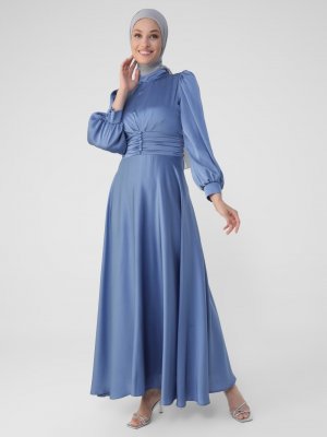Refka Bebe Mavisi Brit Detaylı Saten Abiye Elbise