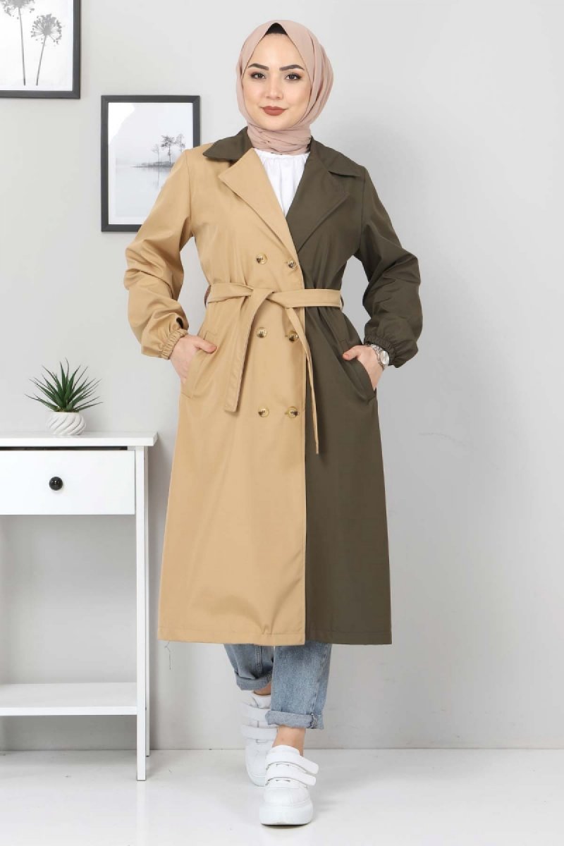 Tesettür Dünyası Haki İki Renkli Trençkot