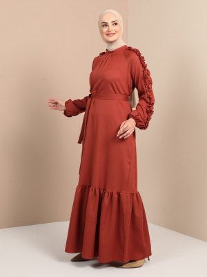 Tavin Kiremit Kolları Fırfırlı Kuşaklı Elbise