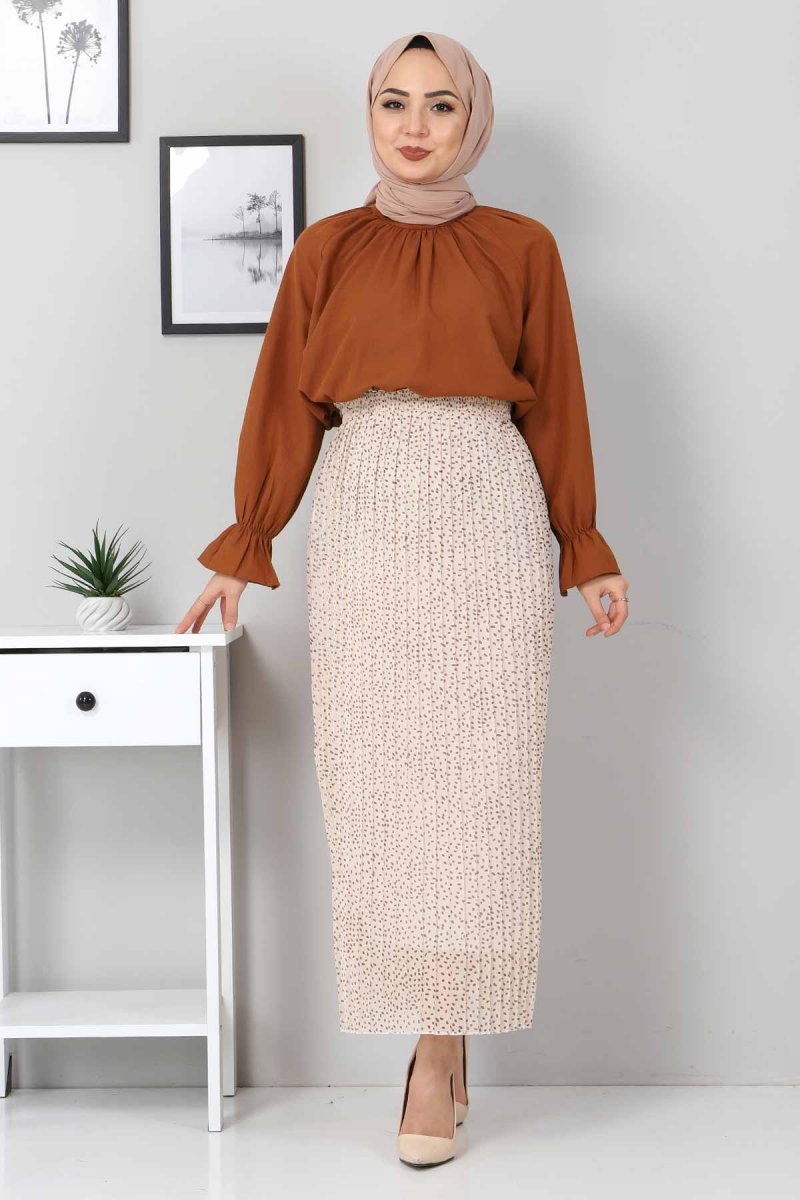 Tesettür Dünyası Bej Çıtır Desenli Piliseli Etek
