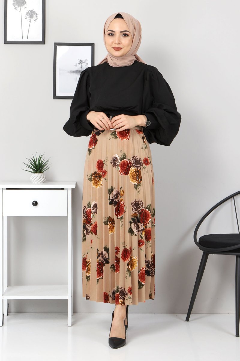 Tesettür Dünyası Vizon Çiçekli Piliseli Etek