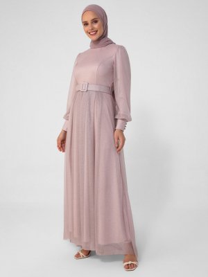 Refka Derin Pembe Simli Kemerli Abiye Elbise
