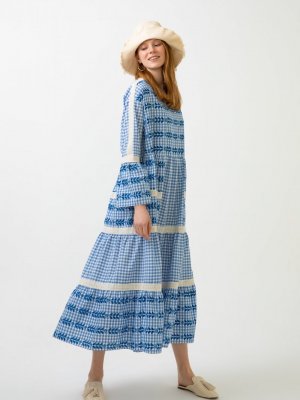 Touche Prive Mavi Pötikare Etnik Büzgülü Elbise