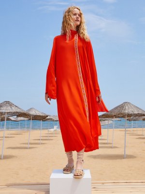 Touche Prive Coral Etnik Şeritli Viskon Elbise