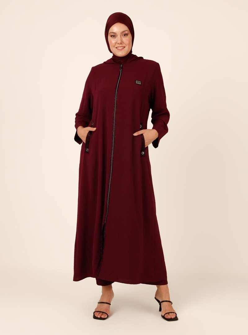 GELİNCE Vişne Boydan Fermuarlı Kapüşonlu Ferace