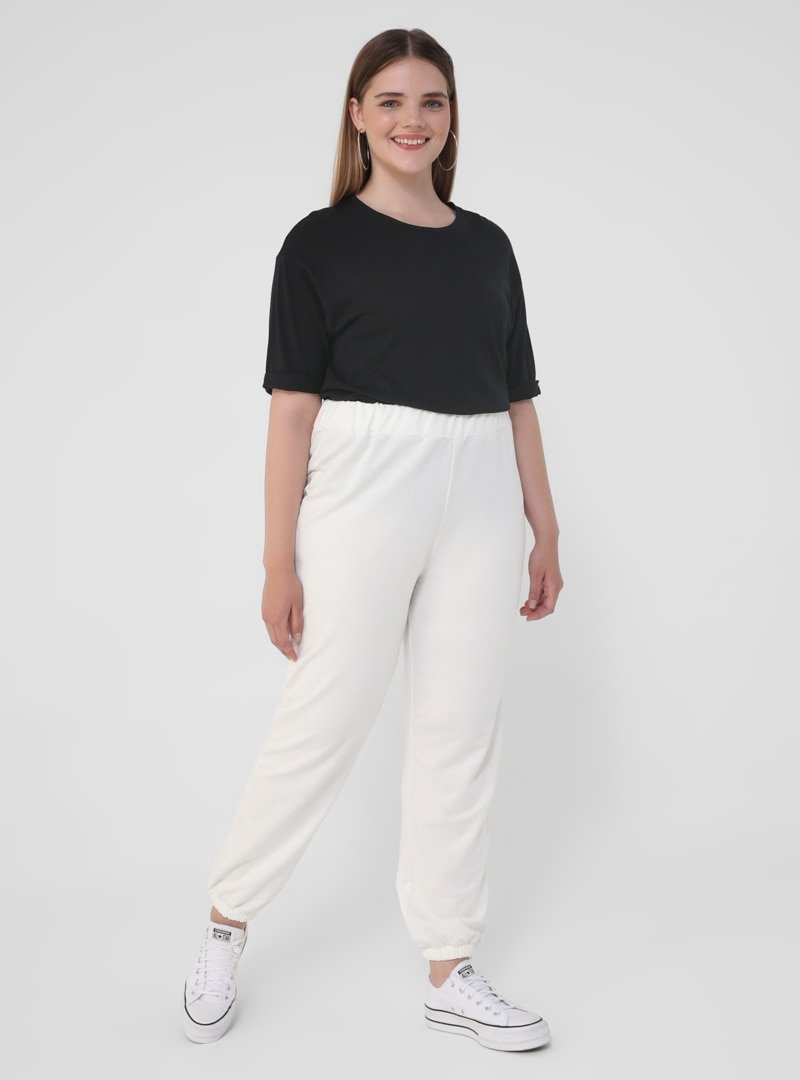 Alia Ekru Büyük Beden Pamuklu Beli Lastikli Jogger Pantolon