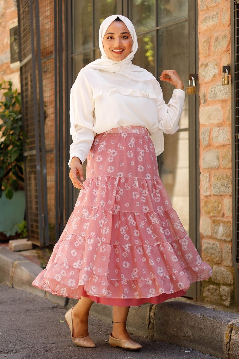 In Style Pudra Kasımpatı Desen Astarlı Şifon Etek