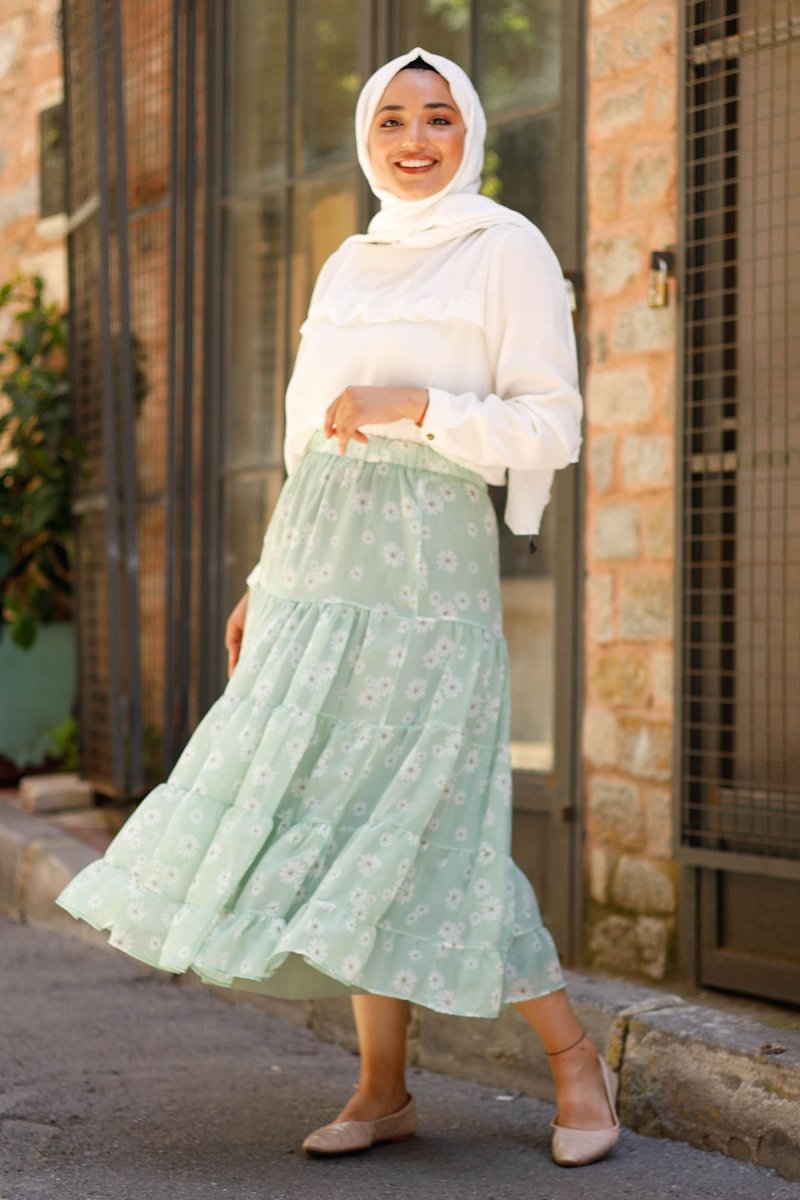 In Style Mint Kasımpatı Desen Astarlı Şifon Etek