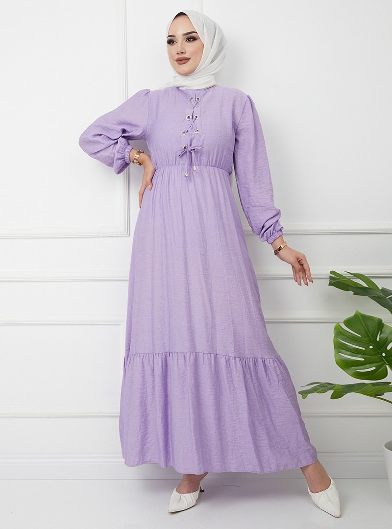 Olcay Lila Önü Bağcık Detaylı Beli ve Robası Büzgülü Elbise