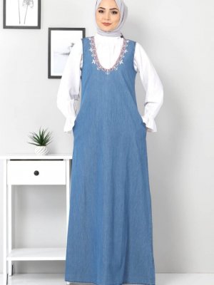 Tesettür Dünyası Açık Mavi Nakışlı Kot Salopet