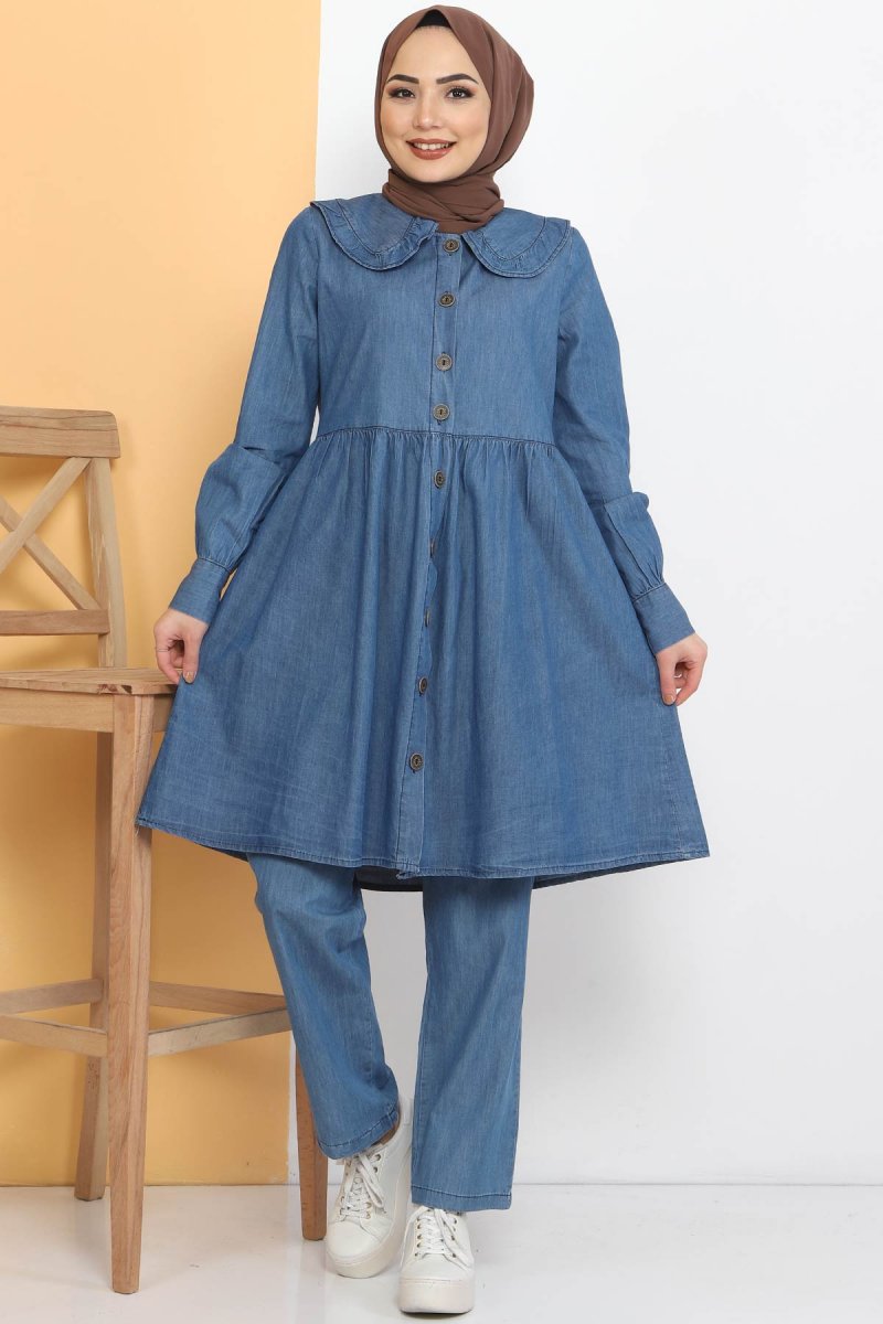 Tesettür Dünyası Açık Mavi Bebe Yaka İkili Kot Takım