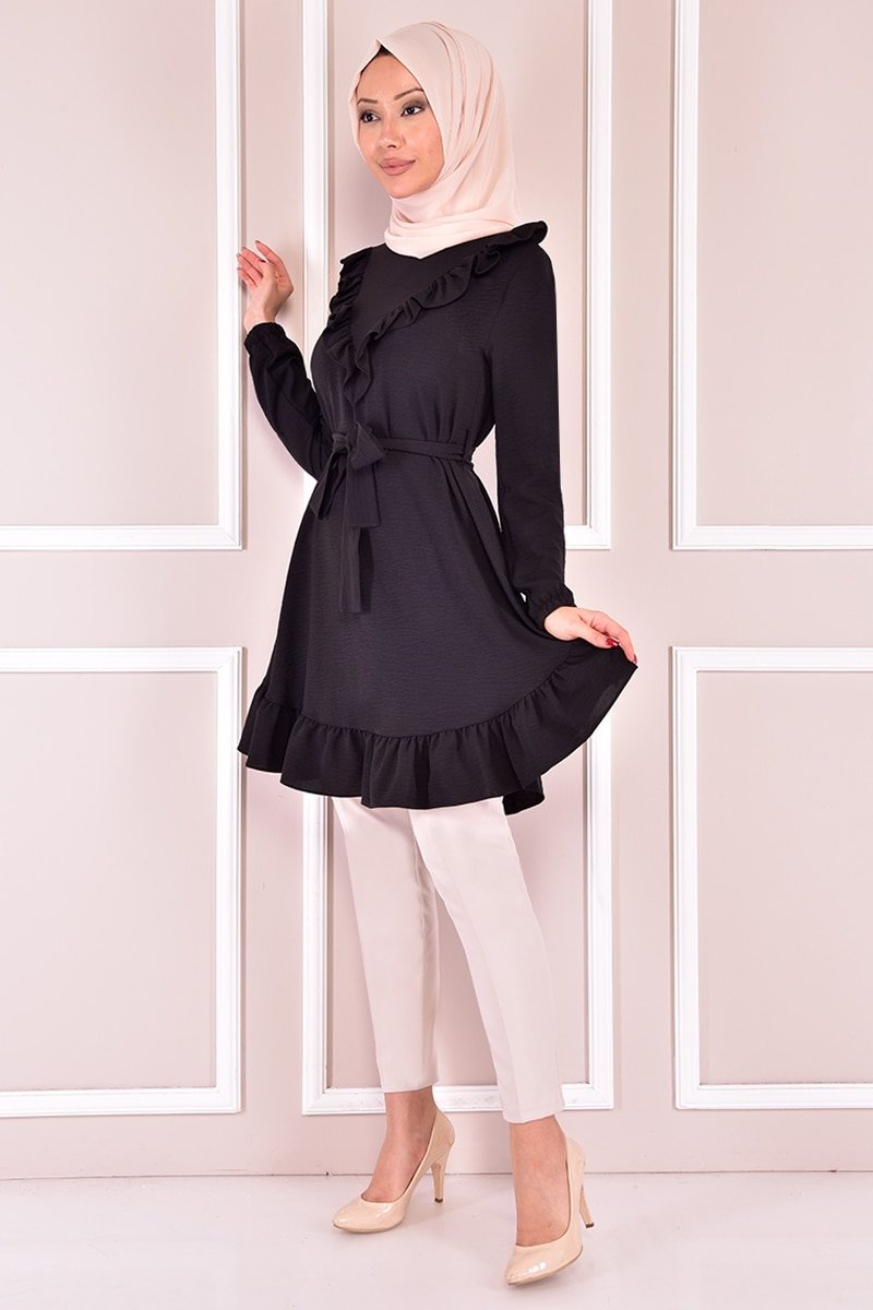 Moda Merve Siyah Fırfırlı Tunik