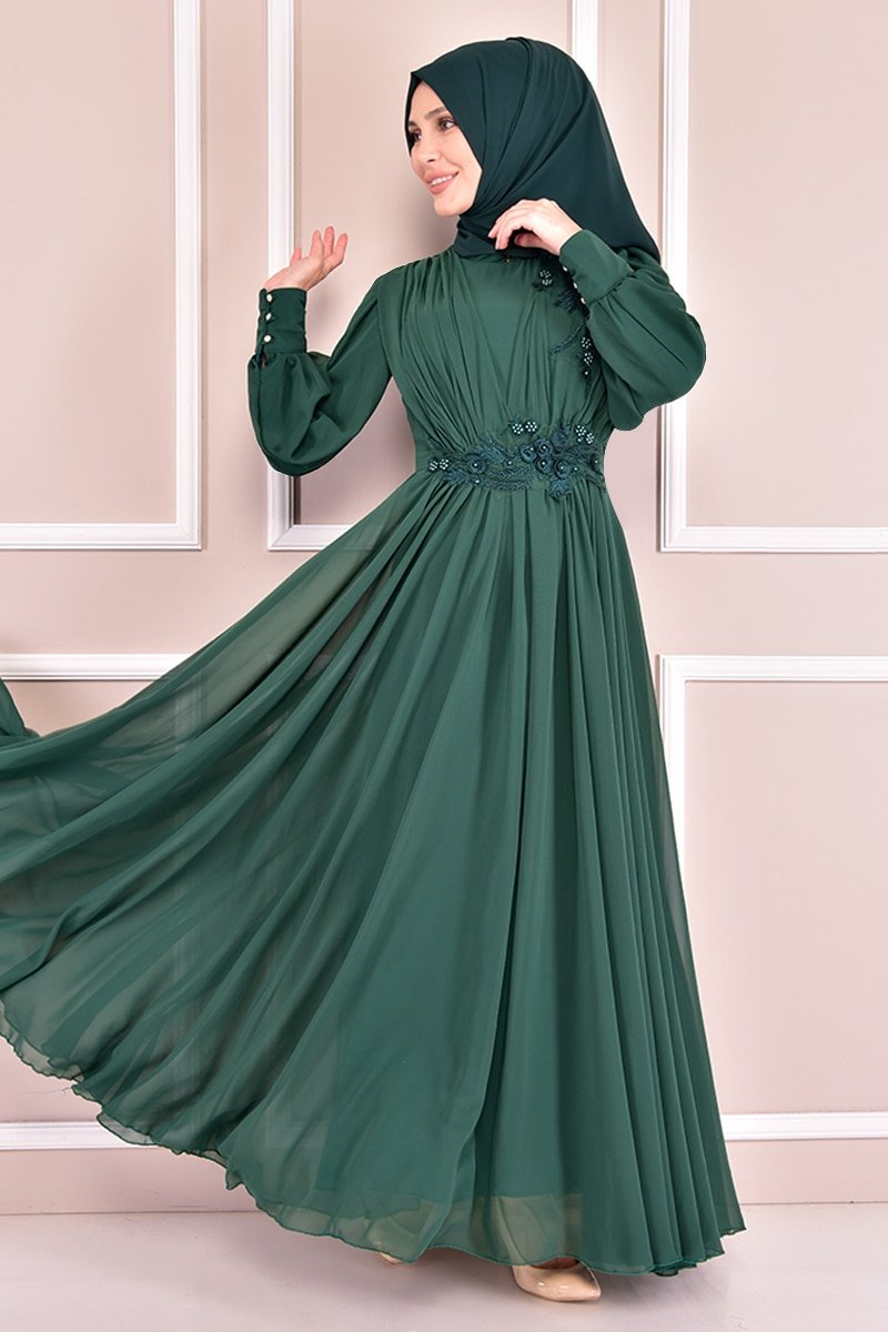 Moda Merve Zümrüt Güpür Detay Abiye Elbise