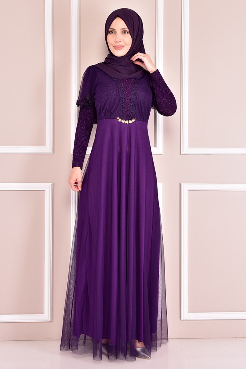 Moda Merve Mor Simli Abiye Elbise