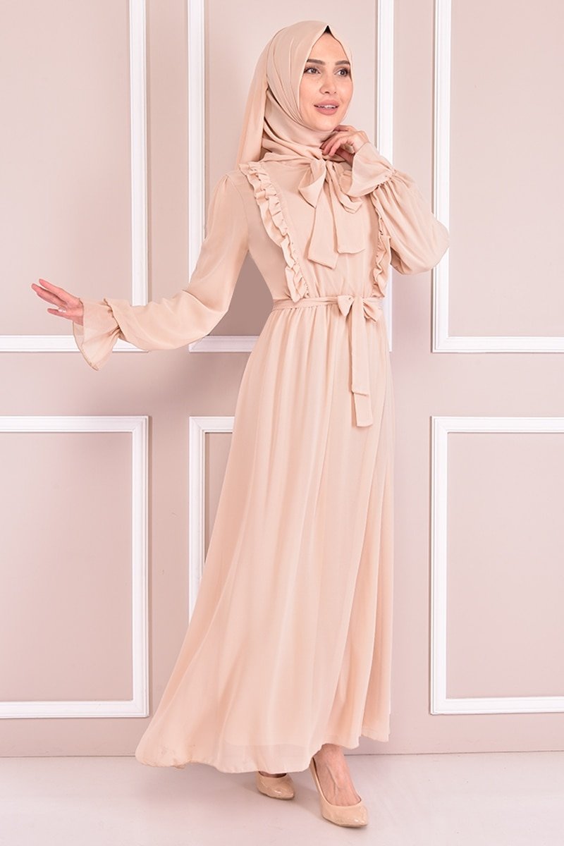 Moda Merve Krem Fırfırlı Şifon Elbise