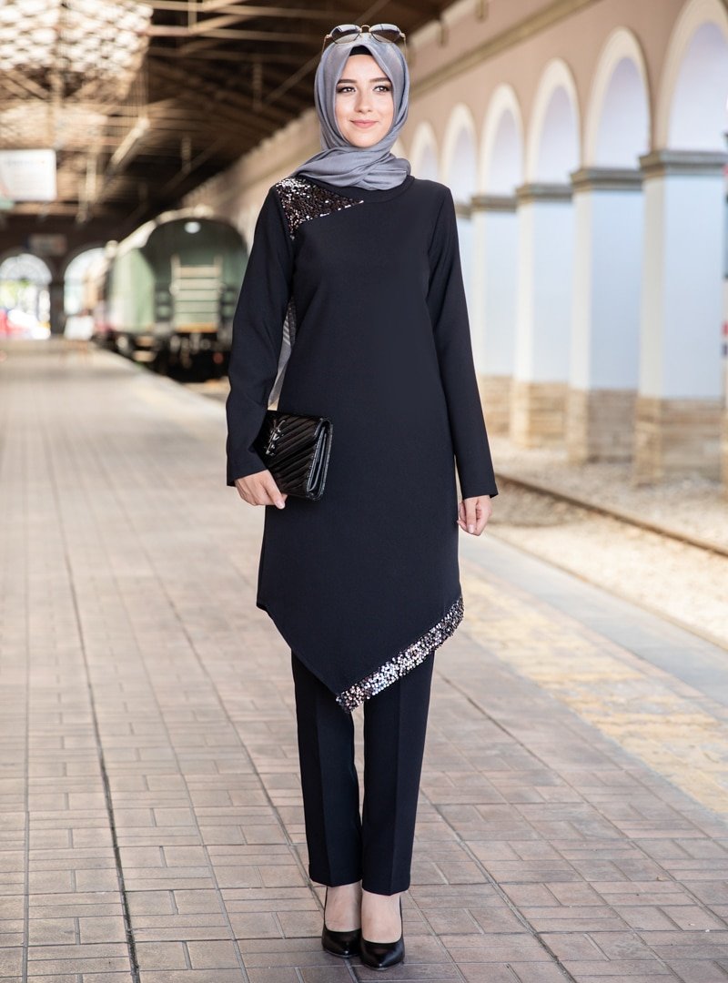 Ahunur Siyah Aslım Tunik&Pantolon İkili Abiye Takım