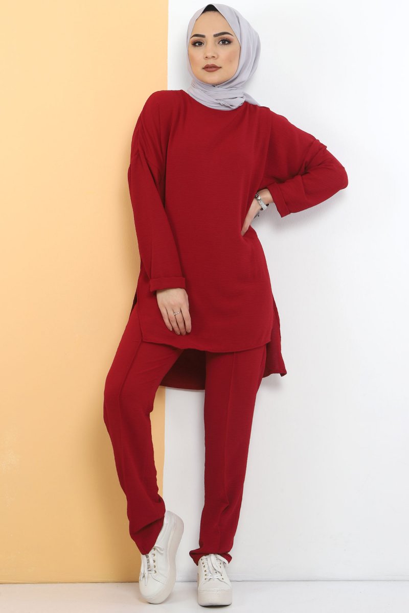 Tesettür Dünyası Bordo Yırtmaçlı Ayrobin İkili Takım