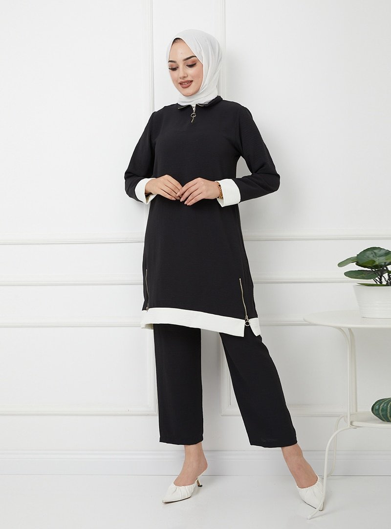 Olcay Siyah İki Renkli Fermuar Detaylı Pantolon Tunik Takım