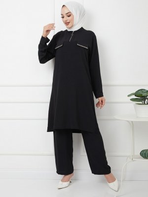 Olcay Siyah Taşlı Şerit ve Fermuar Detaylı Büyük Beden Pantolon Tunik Takım