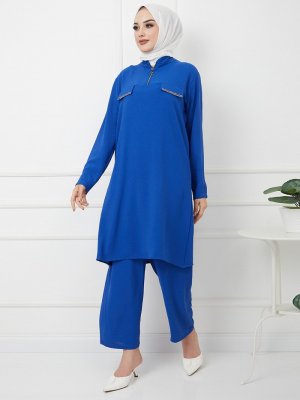 Olcay Saks Taşlı Şerit ve Fermuar Detaylı Büyük Beden Pantolon Tunik Takım
