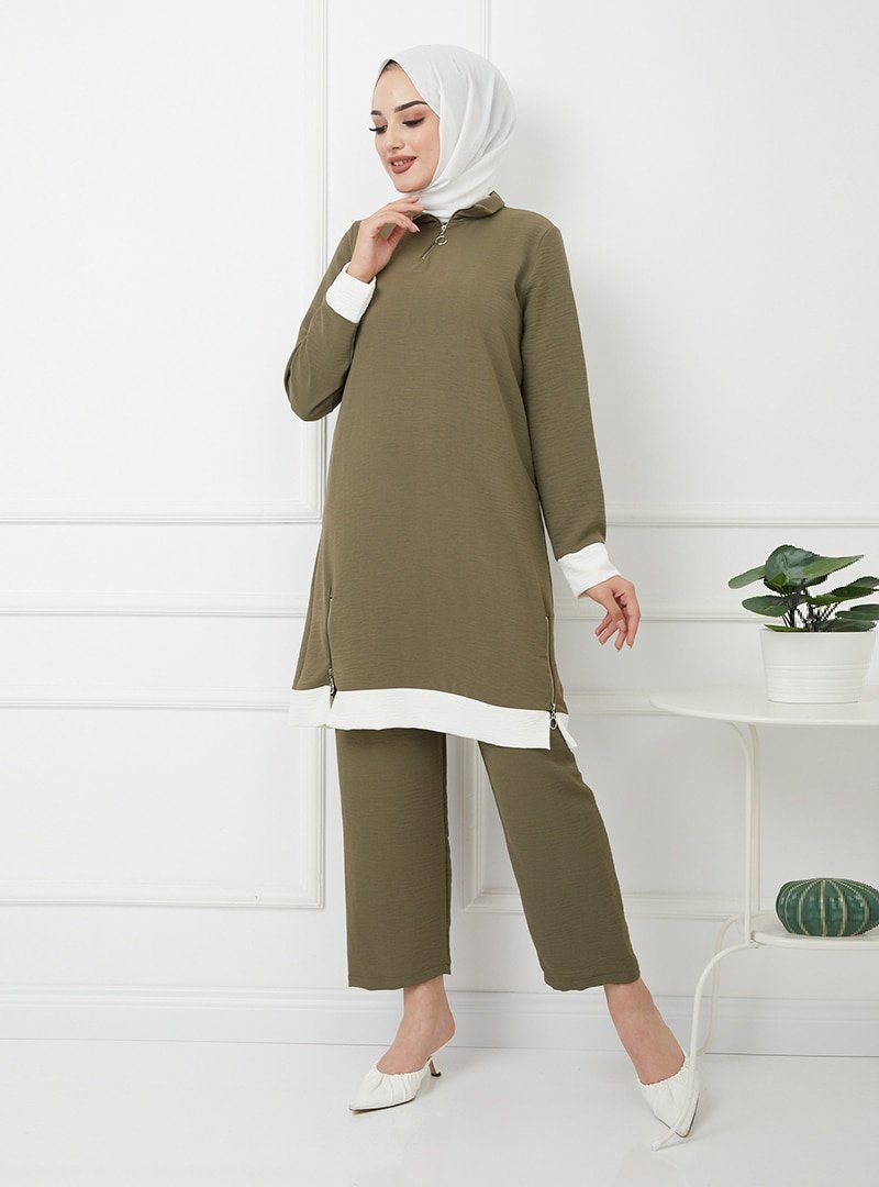 Olcay Haki İki Renkli Fermuar Detaylı Pantolon Tunik Takım