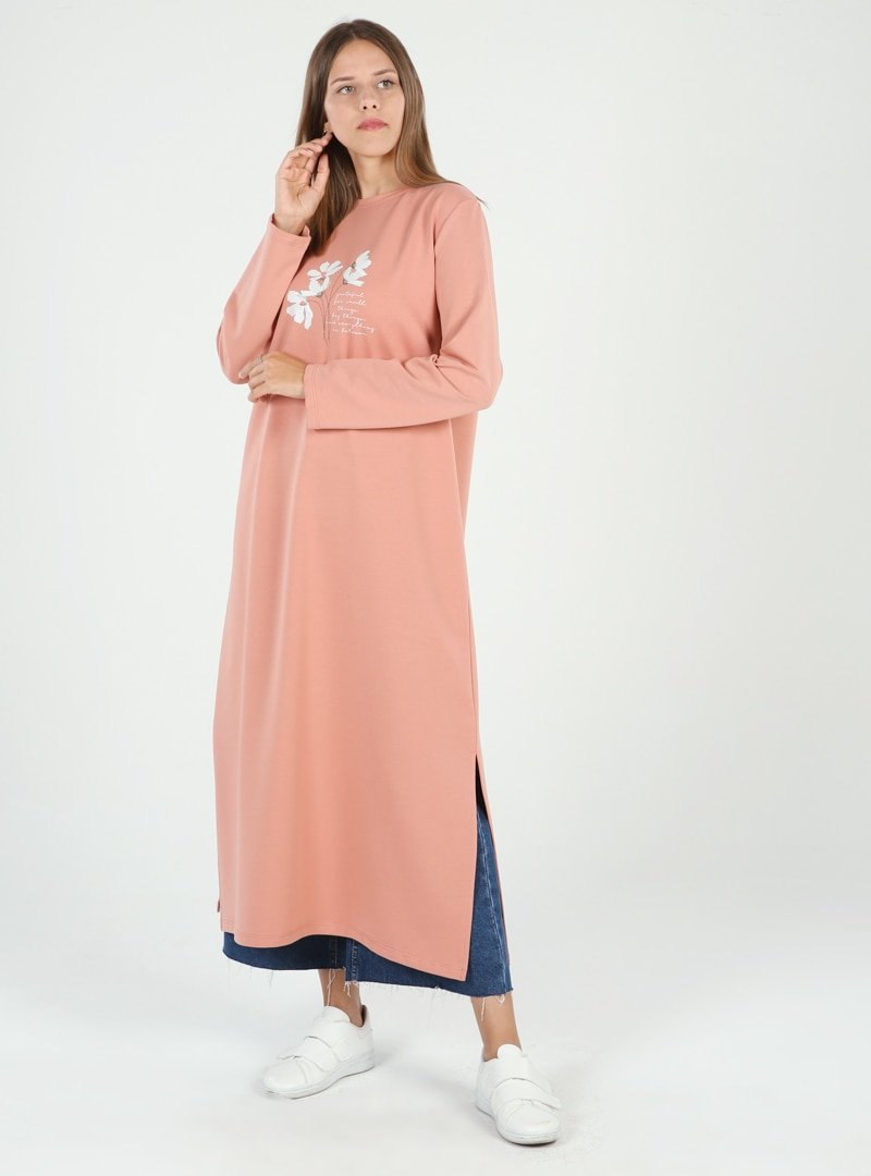 Allday Gül Kurusu Baskılı Yırtmaçlı Uzun Tunik