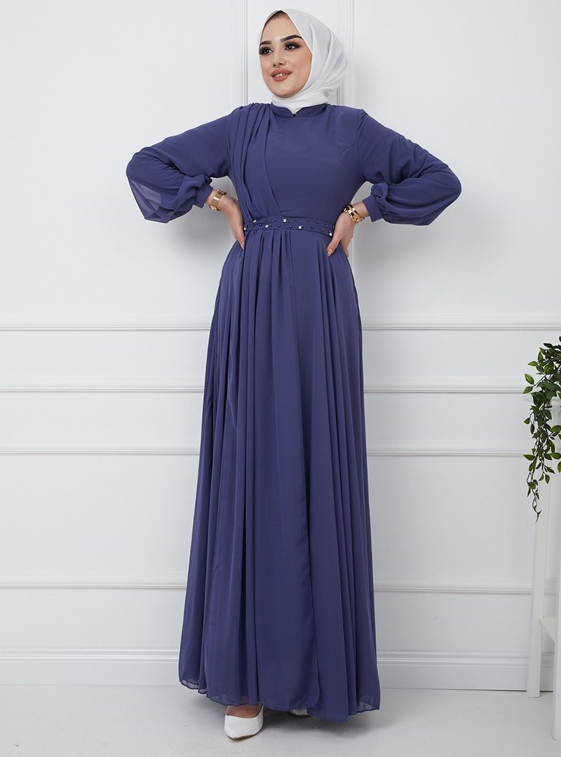 Olcay İndigo Kemeri Taş ve İnci Süslemeli Şifon Detaylı Abiye Elbise