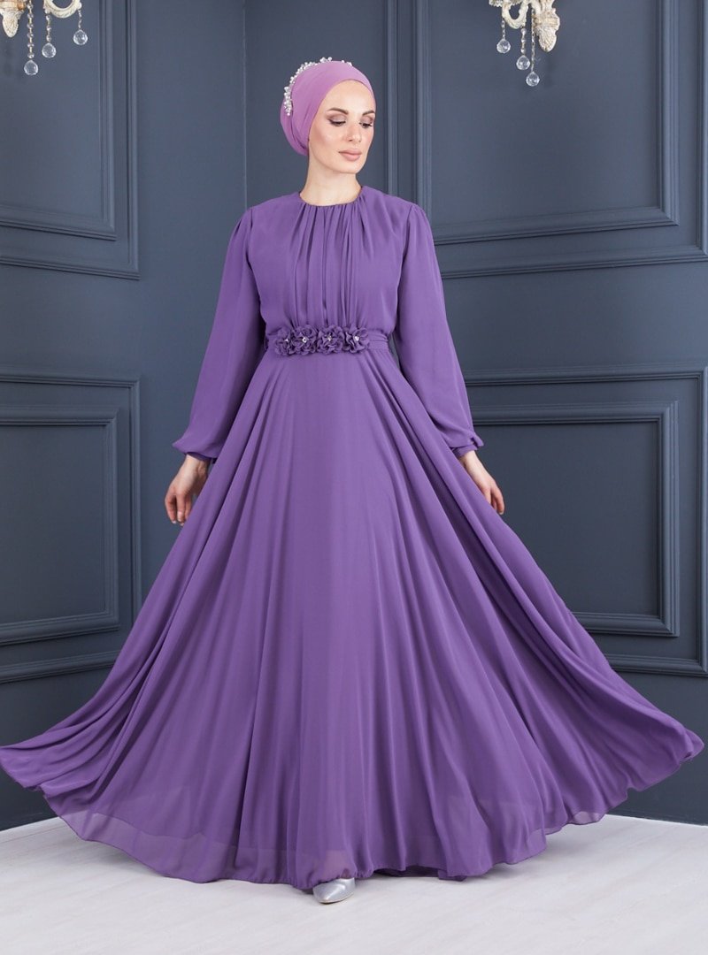 Sew&Design Lila Balon Kol Kemerli Abiye Elbise