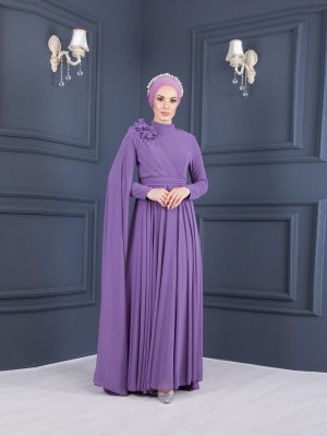 Sew&Design Lila Omuzu Çiçekli Pileli Şifon Abiye Elbise