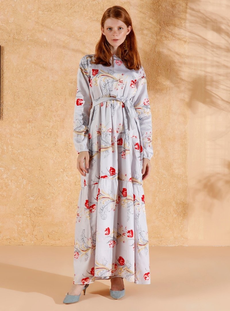 Ceylan Otantik Gri Lale Desen Kat Kat Elbise