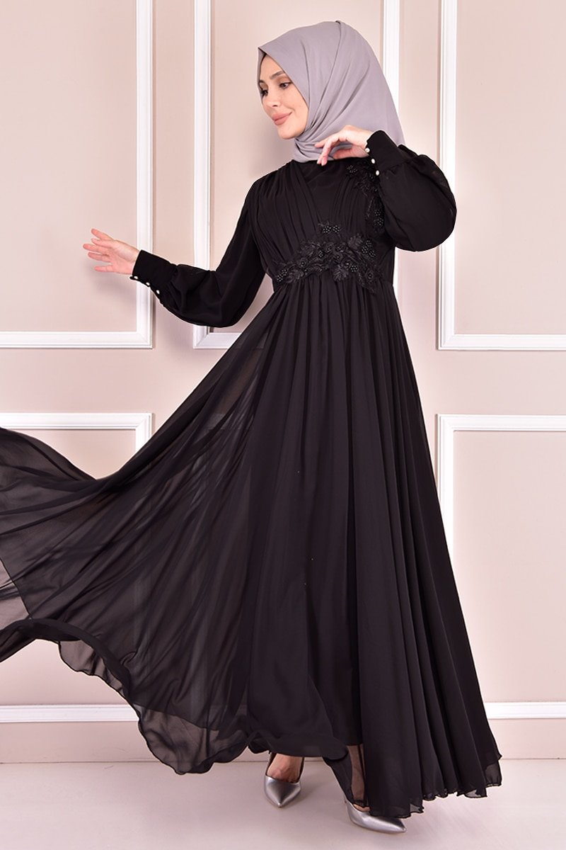 Moda Merve Siyah Güpür Detay Abiye Elbise