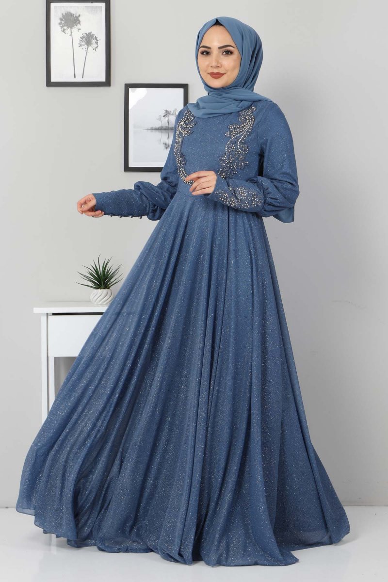MISSVALLE Mavi Dantel Detaylı Simli Abiye Elbise