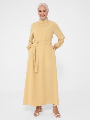 Refka Antik Gold Dik Yaka Kemer Detaylı Elbise