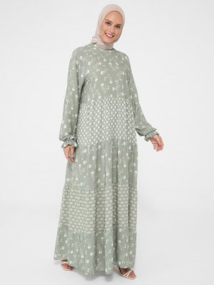 Refka Açık Haki Doğal Kumaşlı Desenli Elbise