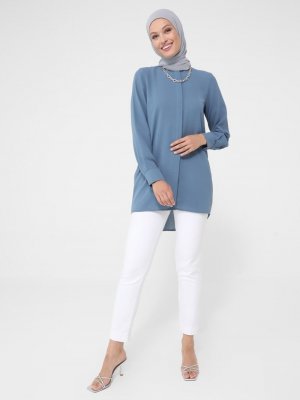 Refka Açık Petrol Gizli Düğmeli Arkası Uzun Aerobin Tunik