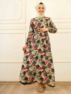 Moda Dua Çok Renkli Belden Kemerli Viskon Elbise