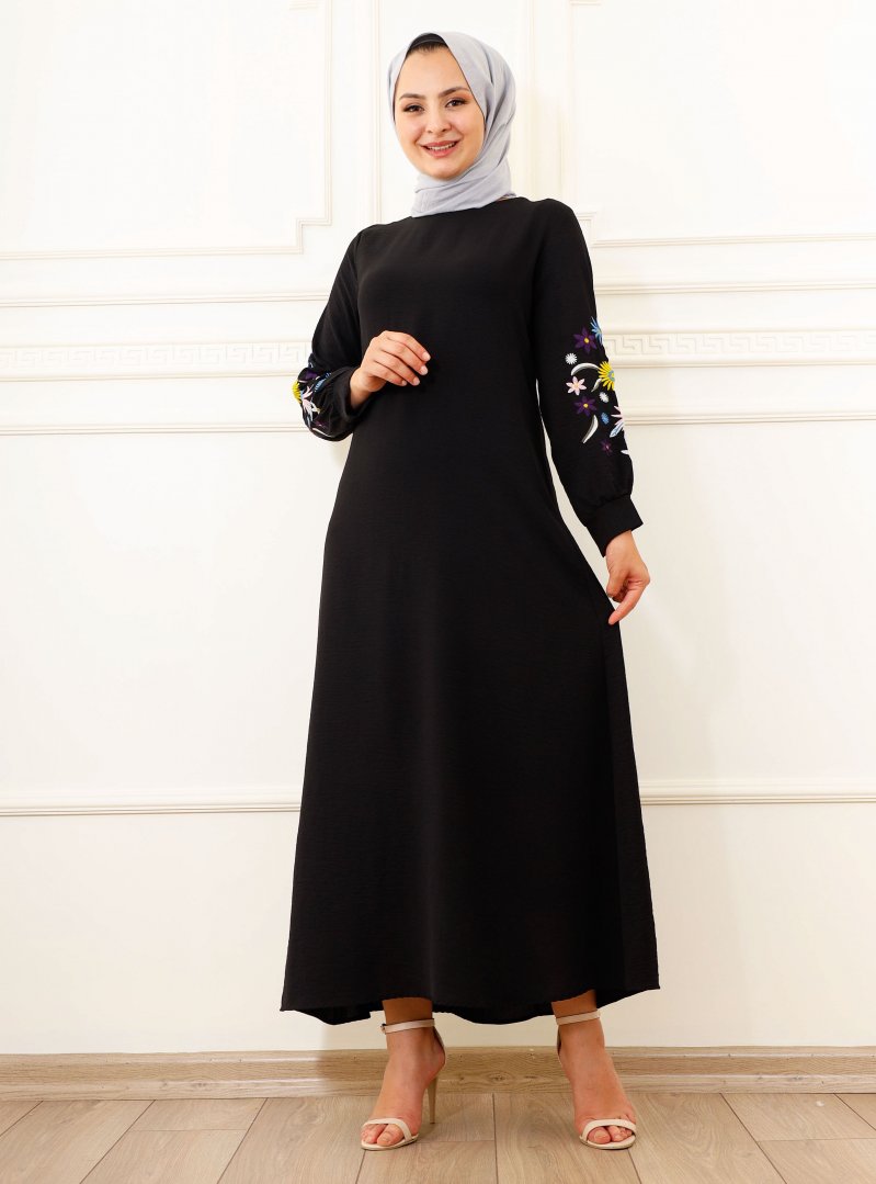 Moda Dua Siyah Kolu Nakışlı Elbise