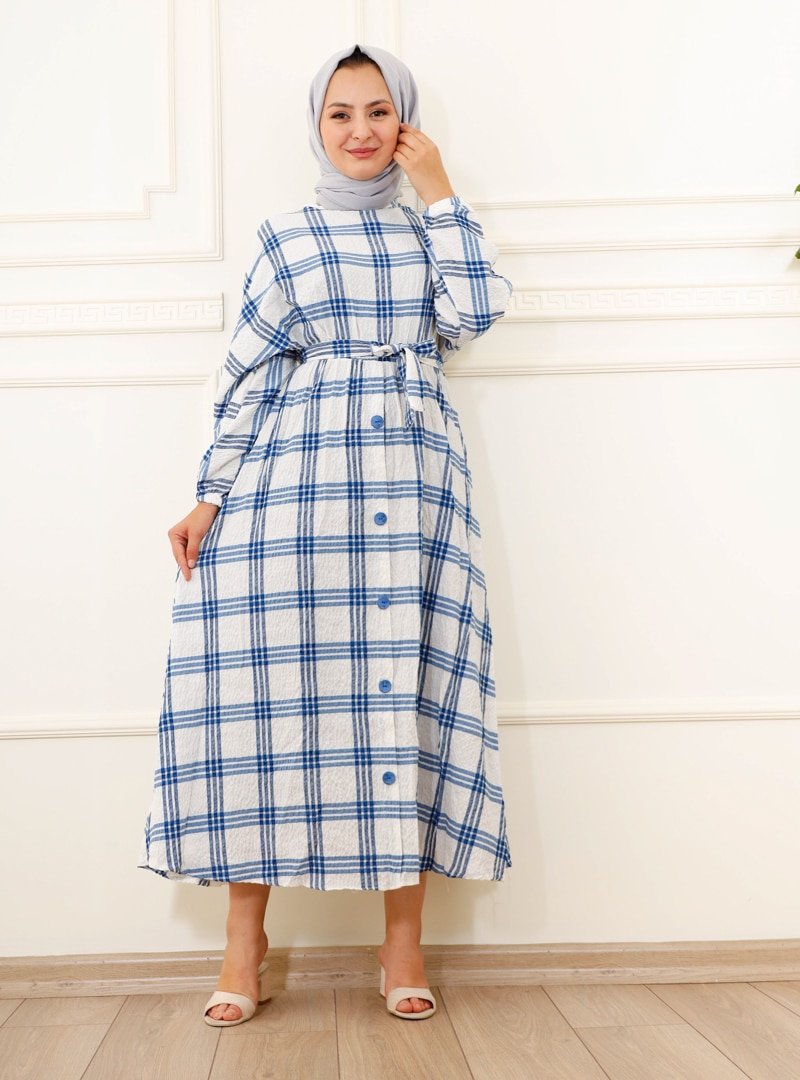 Moda Dua Saks Mavisi Ekoseli Elbise