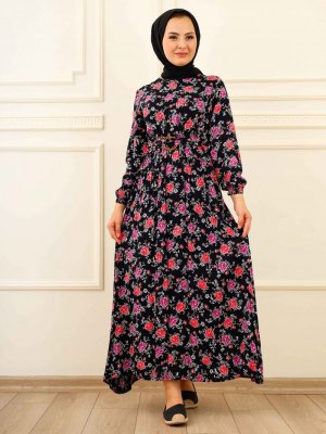 Moda Dua Siyah Belden Kemerli Viskon Elbise