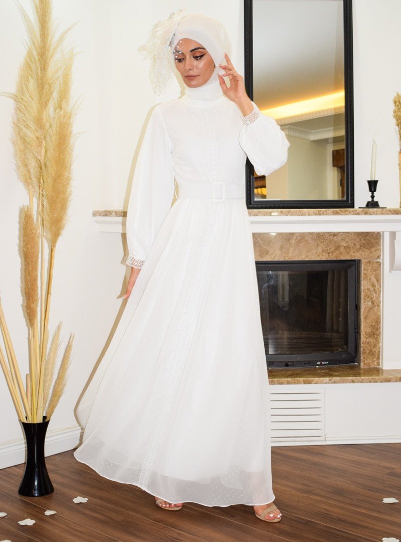 Sew&Design Beyaz Kemerli Dantel Şeritli Nikah Abiye Elbise