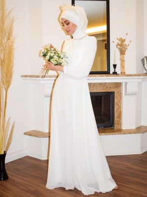 Sew&Design Beyaz Kemerli Pileli Kloş Nikah Abiye Elbise