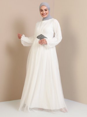 Tavin Ekru Beli Taş Detaylı Tüllü Abiye Elbise