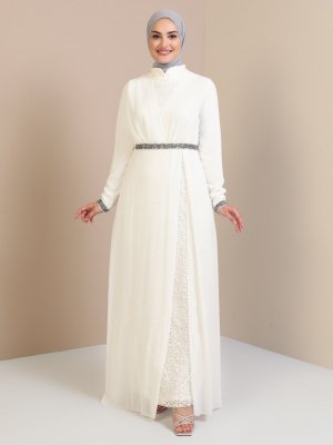 Tavin Beyaz Taş Detaylı Tüllü Abiye Elbise