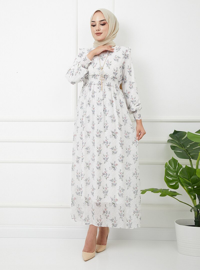 Olcay Ekru Beli Ve Kol Ağzı Lastik Detaylı Kolyeli Elbise