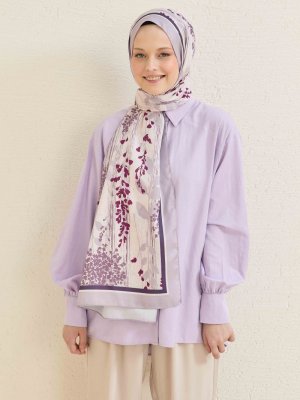 Burden İpek Lila Mimosa Çiçek Desenli Twill Şal
