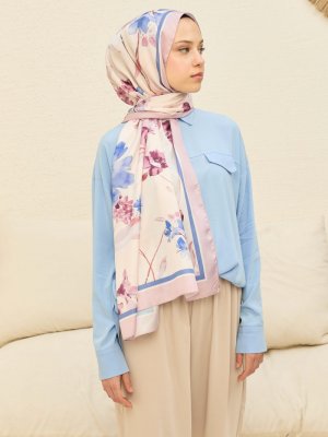 Burden İpek Pudra Rosa Çiçek Desenli Twill Şal