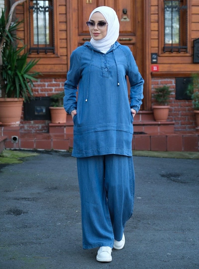 Neways Koyu Mavi Kapüşonlu Tensel Tunik